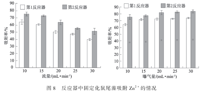 從圖8 可以看出,在反應(yīng)器運行的過程中通過調(diào)節(jié)流量,吸附率變化明顯。廢水經(jīng)過第1 個反應(yīng)器時,吸附效果不明顯,最高只能達(dá)到64% 。當(dāng)廢水繼續(xù)經(jīng)過第2 個的反應(yīng)后,出水達(dá)到75% ,提高了10% 。如果流速降低則運行時間過長,效率降低;如果流速過快,則顆粒物不能和廢水充分反應(yīng),吸附率達(dá)不到理想的效果。由于模擬廢水處理過程中中不能實現(xiàn)振蕩吸附,效果相較于前面實驗結(jié)果略差。為了進(jìn)一步提高吸附率,遂進(jìn)行了曝氣處理,增加顆粒內(nèi)水體的置換效率,達(dá)到更好的去除效果。在10 mL·min - 1 運行條件下,曝氣量由小變大,吸附率也由75. 5% 提高到83. 6% 。在曝氣量為30 mL·min - 1 后吸附率只提高了1. 5% ;故曝氣量為30 mL·min - 1 時,既能有較好的效果又能節(jié)約電能,同時相較于第1 個反應(yīng)器出水情況,吸附率也提高了接近10% 。實驗表明,相較于單床反應(yīng)器,多床反應(yīng)器顯著的提高了出水水質(zhì),并且對Zn2 + 的吸附率要高于利用固定化生物活性炭與菌類的吸附率 。