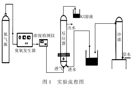 實驗裝置主要由臭氧反應器部分和臭氧發(fā)生器部分構成。臭氧反應器直徑為0. 8 m,高為1. 5 m,材質為有機玻璃;臭氧發(fā)生器最大產(chǎn)量為10 g·h - 1 ,臭氧濃度檢測儀量程為0 ~ 200 mg·L - 1 。