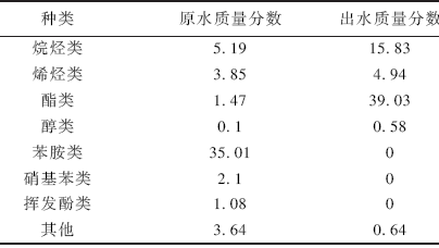 由表4 可以看出,原水含大量的苯胺類物質,達有機物總量的35% ,經(jīng)過催化臭氧化處理,原水中的苯胺類物質可全部去除;另外,原水還含有一定量的酚類和硝基苯類物質,經(jīng)過催化臭氧化處理后也全部被分解。根據(jù)《污水綜合排放標準》規(guī)定,苯胺類、揮發(fā)酚、硝基苯類都屬于第2 類污染物,應嚴格控制排放量,經(jīng)過臭氧處理這些有機物大多數(shù)被分解成簡單的酯類和部分鏈狀烷烴類,能被微生物分解利用,有助于后續(xù)生化處理,可以表現(xiàn)出廢水可生化性的提高。