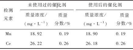 使用電感偶合等離子體發(fā)射光譜儀分析使用前后的催化劑,催化劑有效金屬元素為錳和鈰,對這2種金屬元素進行含量分析,結果見表5。