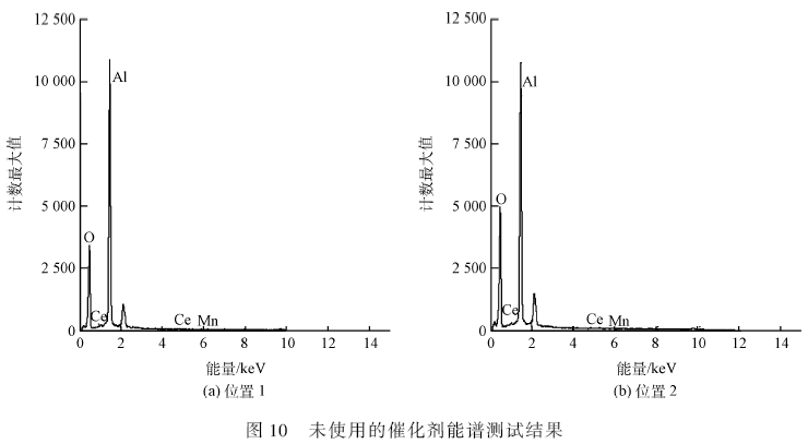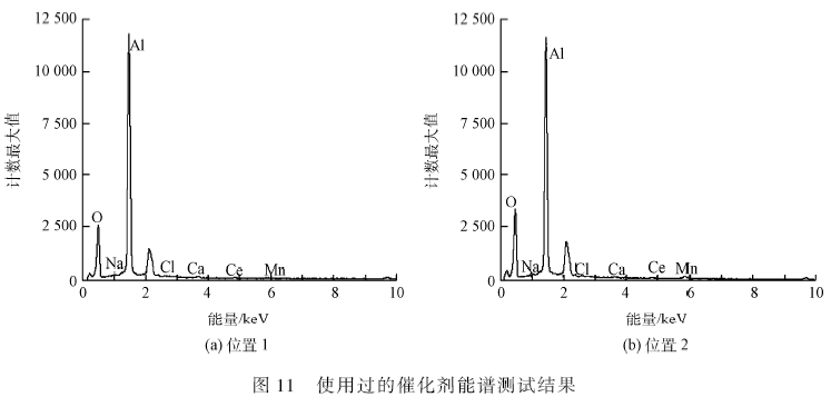 催化劑選用氧化鋁為載體,由表7 數(shù)據(jù)可以看出催化劑表面含大量Al、O 元素,而有效成分Mn、Ce 元素含量較少且不同位置含量有所差別,說明催化劑表面的活性組分負載并不均勻,日后可以改進完善催化劑制備方法。使用后的催化劑表面能檢測到微量的Na、Ca、Cl 等元素,可能是自廢水中吸附所得,因此建議催化劑在使用過程中定期沖洗以去除這些微量附著物,以免影響催化活性。
