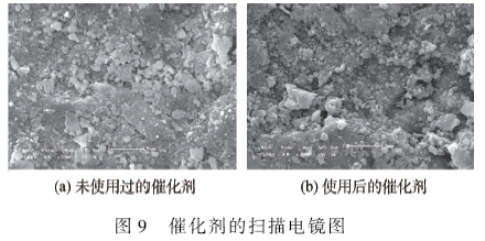 對于使用前后的催化劑進行掃描電鏡分析,根據(jù)圖9 可以看出,催化劑表面晶體形態(tài)不規(guī)則,表面粗糙,有較大的表面積,使用前后形態(tài)幾乎一致,沒有明顯的改變。
