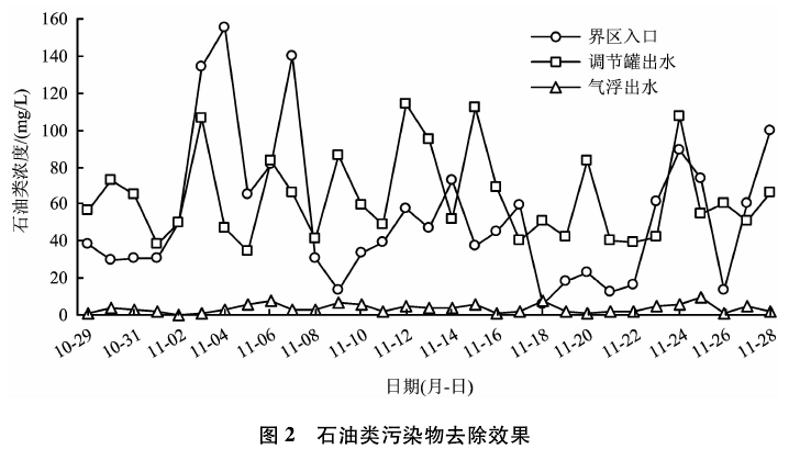污水處理廠界區(qū)入口處石油類污染物的平均濃度為 53.74mg/L,最大值為 155.00mg/L;經(jīng)調(diào)節(jié)罐隔油處理后,石油類污染物的平均濃度為 63.77mg/L,最大值為 114.00mg/L;經(jīng)斜板隔油—兩級氣浮后,出水石油類污染物的平均濃度為 3.57mg/L,最大值為 9.36mg/L。各處理單元石油類污染物監(jiān)測指標(biāo)見圖 2。由圖 2可知,石油類污染物可達(dá)標(biāo)排放。