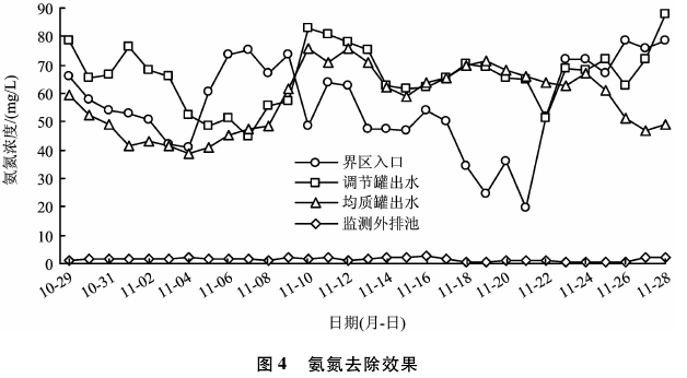 污水處理廠界區(qū)入口處 COD的平均值為3887mg/L,最大值為 6631mg/L;經(jīng)隔油處理、均質(zhì)調(diào)節(jié)后,COD的平均值為1947mg/L,最大值為2268mg/L;經(jīng) A2O生化池 +MBR+臭氧氧化后,COD的平均值為 107mg/L,最大值為 139mg/L。各處理單元氨氮監(jiān)測指標(biāo)見圖 3。由圖 3可知,進(jìn)水 COD大幅超設(shè)計(jì)標(biāo)準(zhǔn),處理后污水不能達(dá)標(biāo)排放。