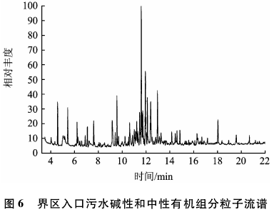 界區(qū)入口污水酸性及堿性、中性萃取物的 GC/MS分析結(jié)果見圖 5和圖 6。由圖 5和圖 6可知,其主要污染物為環(huán)烷酸、低級脂肪酸、含氮雜環(huán)化合物及苯酚類化合物。