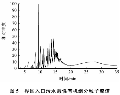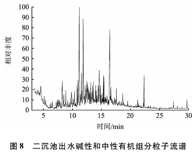 生化二沉出水酸性及堿性、中性萃取物的 GC/MS分析結(jié)果見圖 7和圖 8。