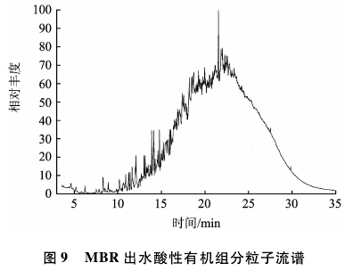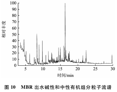 MBR出水酸性及堿性、中性萃取物的 GC/MS分析結(jié)果見圖9和圖10。由圖9和圖10可知,其主要污染物為環(huán)烷酸、茚酮類、環(huán)烯(烷)烴、含氮雜環(huán)化合物及鄰苯二甲酸酯類。