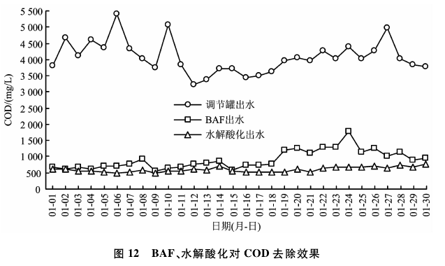 由圖 12可知,升級改造后調(diào)節(jié)罐出水 COD平均值為 4073.5mg/L,最大值為 5395.0mg/L;經(jīng)曝氣生物濾池好氧氧化后出水 COD平均值為 902.5mg/L,最 大 值 為 1790.0 mg/L,COD 去 除 率 為77.8%;經(jīng)水解酸化后出水 COD平均值為 598.0mg/L,最大值為765.0mg/L,COD去除率為33.7%。