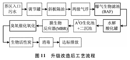 根據(jù)文獻(xiàn)資料并結(jié)合項(xiàng)目現(xiàn)場開展的中試試驗(yàn)結(jié)果,確定本次升級改造工藝:界區(qū)入口污水經(jīng)原有調(diào)節(jié)罐調(diào)節(jié),而后依次經(jīng)斜板隔油、兩級氣浮去除石油類;氣浮出水經(jīng)泵提升至新增的 BAF,其出水經(jīng)泵提升至升流式水解酸化罐(原均質(zhì)罐改造);水解酸化出水依次經(jīng)原有 A2O生化池、二沉池及 MBR;MBR出水經(jīng)泵提升至臭氧催化氧化塔(原臭氧氧化塔改造),其出水依次經(jīng)生物活性炭、消毒后達(dá)標(biāo)排放。升級改造后流程見圖 11。