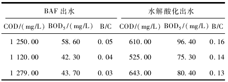 BAF和水解酸化出水 COD、BOD5檢測結(jié)果見表 2。