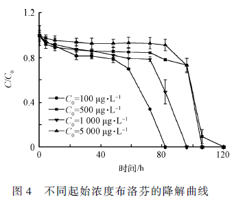 通過(guò)惰性吸附實(shí)驗(yàn)和生物降解實(shí)驗(yàn)的對(duì)比,可以探討SDB 活性污泥對(duì)IBU 的處理能力及其去除機(jī)理。從圖4 可以看出,在反應(yīng)時(shí)間24 h 內(nèi),IBU 濃度下降緩慢,去除率為6. 7% ~ 18. 1% 。此時(shí),SDB 主要通過(guò)吸附作用將水相中的IBU 轉(zhuǎn)移至胞體上 ,IBU 的比去除量分別達(dá)到0. 5、1. 6、3. 1 和6. 8 μg·(g MLVSS·h) - 1 。對(duì)比圖3 可知,活性污泥的生物吸附作用比較弱,這是由于滅活污泥的細(xì)胞表面發(fā)生了結(jié)構(gòu)變化,通透性增強(qiáng),污染物易進(jìn)出細(xì)胞內(nèi)部,因此細(xì)胞會(huì)表現(xiàn)出更好的污染物積累效果,同時(shí)污染物也容易發(fā)生解吸,故在24 h 內(nèi),滅活污泥比活性污泥對(duì)IBU 的吸附作用強(qiáng)。在生物降解反應(yīng)后期,隨著培養(yǎng)時(shí)間的延長(zhǎng),生物降解作用逐漸增強(qiáng),從60 h 后,SDB 開(kāi)始加快對(duì)IBU 的降解作用,IBU 濃度急劇下降,直至降為零。隨著IBU 起始濃度的增加,SDB 完全降解IBU 所需的時(shí)間增加,時(shí)間跨度為82 ~ 106 h,而SDB 對(duì)IBU 的單位去除速率進(jìn)一步增加,比去除量分別為0. 76、2. 49、6. 5 和23. 8 μg·(g MLVSS·h) - 1 。