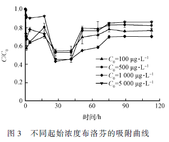 為考察SDB 活性污泥對(duì)IBU 的生物降解作用,實(shí)驗(yàn)采用未滅活的SDB 活性污泥來(lái)進(jìn)行研究。其他實(shí)驗(yàn)操作同上述吸附實(shí)驗(yàn)。