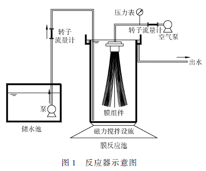 反應(yīng)器示意如圖1。反應(yīng)器裝置為圓柱形,膜組件置于反應(yīng)器中央,呈倒傘型。反應(yīng)器容積為5 L。膜組件為聚丙烯疏水性膜,有效面積為0. 2 m2 ,平均外徑為0. 5 mm,壁厚50 um,截留分子量為10 萬道爾頓。供氣壓力為7. 0 kPa。進(jìn)水由蠕動泵從廢水池中抽出后,注入反應(yīng)器中,反應(yīng)器中的混合液經(jīng)曝氣膜上生物膜處理后自流出水。