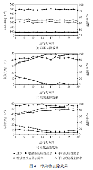 根據(jù)汪舒怡等的研究結(jié)果,采用水力停留時(shí)間為5 h,運(yùn)行負(fù)荷為7. 6 g COD·(m2 ·d) - 1 。由于處理的水樣及選取的污泥均取自同一污水廠,因此本研究未進(jìn)行污泥馴化,掛膜后直接進(jìn)入污染物去除階段,主要考察平行反應(yīng)器對污水的去除效果。圖4 為運(yùn)行期污染物去除的效果。