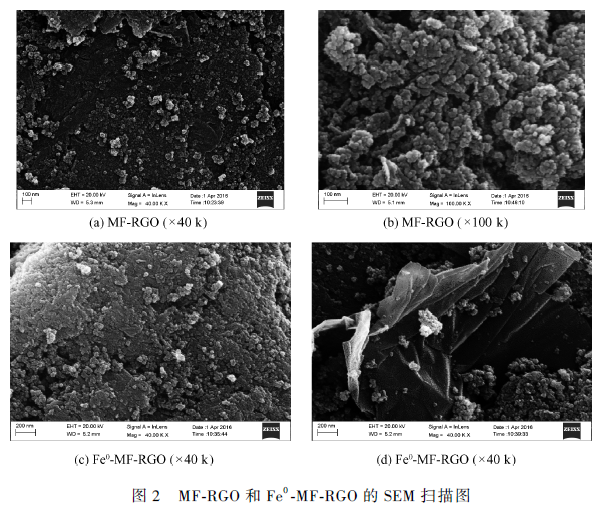 圖2 為Fe0 -MF-RGO 和MF-RGO 的SEM 掃描圖。由圖2 可知, 石墨烯薄層褶皺形態(tài)在40 000 倍下可見材料表面覆蓋一層球狀顆粒,粒徑約在20 ~ 25 nm 范圍之內。100 000 倍下球狀顆粒的堆積形態(tài)更加清晰,為Fe3 O4 粒子。圖像中分散在石墨烯表面粒徑在150 ~ 200 nm 范圍的由小粒子聚集而成的大顆粒,可能為包裹了納米零價鐵的Fe3 O4 粒子團。