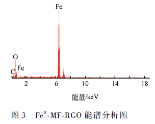 圖3 為Fe0 -MF-RGO 能譜分析圖。EDS 的定量分析結果以Wt% 和At% 表示,其中,Wt% 為質量百分比,At% 為原子百分比。EDS 分析發(fā)現(xiàn)樣品的組成元素為C、O 和Fe,定量分析結果如表1 所示,其含量(質量百分比,Wt% )分別為12. 63% 、34. 37% 和53. 01% ,材料以Fe 和O 元素占主導。C∶ O∶ Fe 原子數(shù)比例約為1 ∶ 2 ∶ 1。所選的4 個不同微區(qū)下3 種元素的含量略有差異, 但差別不大, 說明制備的Fe0 -MFRGO樣品相對比較均勻。