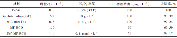 幾種非均相類芬頓試劑催化降解羅丹明B 以及磁性還原氧化石墨烯(MF-RGO)吸附羅丹明B 的效果如表4 所示。對比結果顯示本實驗合成的Fe0 -MF-RGO 材料是一種高效的類芬頓試劑,具有材料用量少、對羅丹明B 去除效率高的特點,并且類芬頓降解過程對羅丹明B 的去除效率顯著高于吸附過程。