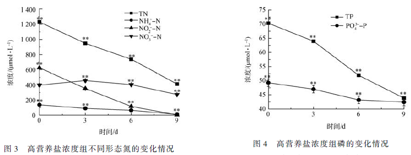 圖3 為高營(yíng)養(yǎng)鹽濃度的養(yǎng)蝦廢水組,其中N 含量很高,TN 濃度達(dá)1 231. 6 μmol·L - 1 ,NO2- -N、NH4+ -N和NO3- -N 濃度分別可達(dá)625. 3、137 和398. 4 μmol·L - 1 。實(shí)驗(yàn)期間,系統(tǒng)中的NH4+ -N、NO2- -N 的濃度下降非?,尤其是NO2- -N,實(shí)驗(yàn)期間從625. 3 μmol·L - 1 到3. 4 μmol·L - 1 ,降低了99. 5% ;NH4+ -N 濃度從137 μmol·L - 1 降到10. 4 μmol·L - 1 ,下降了92. 4% ;而NO3- -N 的濃度在前6 d 略有上升,在NO2- -N和NH4+ -N 濃度明顯下降后,NO3- -N 濃度開(kāi)始下降;TN 濃度由1 231. 6 μmol·L - 1 降至421. 5 μmol·L - 1 ,下降了66. 5% 。