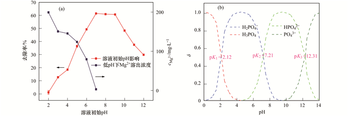 (a)溶液初始pH值對(duì)MgO-BC吸附P的影響和低pH條件下Mg溶出濃度;(b)溶液pH值對(duì)P存在形態(tài)的影響