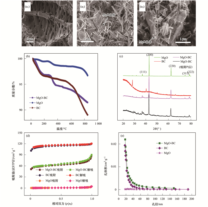 (a1) BC、(a2) MgO和(a3) MgO-BC的SEM圖;(b)BC、MgO和MgO-BC的熱重曲線;(c)BC、MgO和MgO-BC吸附P前后的XRD圖譜;(d)BC、MgO和MgO-BC的N2吸附/脫附等溫線;(e) BC、MgO和MgO-BC的孔徑分布