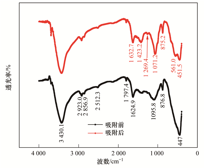 為更深入地揭示MgO-BC吸附水體中P的機(jī)制,本研究還將吸附P前后的MgO-BC進(jìn)行了紅外分析,得到的紅外光譜圖如圖 7所示.從中可知,兩種物質(zhì)的紅外圖譜在3 430 cm-1、1 630 cm-1處均出現(xiàn)了很強(qiáng)的吸收峰,這是樣品中吸收的水分子中羥基振動(dòng)所致.比較吸附P前后的MgO-BC紅外圖譜發(fā)現(xiàn),吸附P后出現(xiàn)了1 423 cm-1和561 cm-1兩處新的吸收峰,代表P—O鍵,可證實(shí)溶液中磷被吸附至復(fù)合材料表面.此外,吸附前的MgO-BC紅外圖譜顯示在波數(shù)1 095 cm-1處出現(xiàn)了明顯的Mg—O鍵吸收峰,從光譜學(xué)角度再次證明氧化鎂被成功負(fù)載于生物質(zhì)炭上,而該吸收峰在磷吸附后遷移至1 071 cm-1處,此處藍(lán)移說(shuō)明Mg—O鍵參與了磷的吸附過(guò)程,且吸附后該鍵作用變強(qiáng).與已有研究對(duì)比發(fā)現(xiàn),1 071 cm-1處對(duì)應(yīng)的化學(xué)鍵為Mg—O—P[15]鍵,指示著負(fù)載的MgO是復(fù)合材料吸附磷活性位點(diǎn)之一,這與競(jìng)爭(zhēng)吸附實(shí)驗(yàn)結(jié)果是一致的.