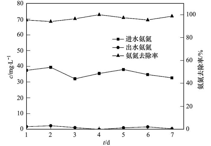 培養(yǎng)過程中反應溫度控制在25℃,DO為1~1.5 mg·L-1范圍內,pH為8~8.4.實驗起始時MLSS為4 030 mg·L-1,MLVSS為2 473 mg·L-1,實驗過程中每天連續(xù)排泥.初期進水氨氮濃度為100 mg·L-1,后逐步提高至700 mg·L-1.水力停留時間由4 h縮短到2 h.