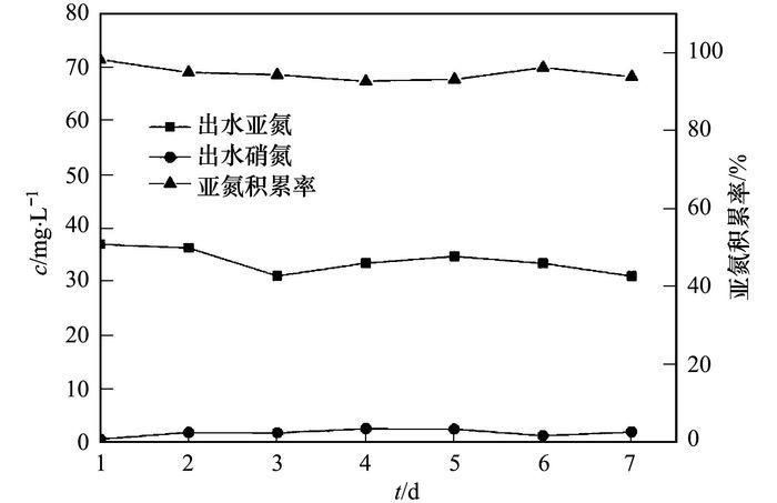 從圖 6可以看出,實驗過程中系統(tǒng)始終保持95%以上亞硝酸鹽氮積累率.證明系統(tǒng)中氨氧化細菌始終保持著絕對的生態(tài)優(yōu)勢.由此可以證明,包埋固定本實驗篩選后的氨氧化細菌有利于實現(xiàn)硝化系統(tǒng)中穩(wěn)定的亞硝酸鹽氮積累.