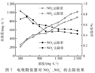 在電吸附裝置最佳運(yùn)行工況下,當(dāng)進(jìn)水濃度分別為300 ~ 2 100 mg·L - 1 時,研究裝置對的NO2 - 和NO3 - 的去除效果。如圖7 所示,裝置在最佳工況下對NO2 - 和NO3 - 的吸附量由最初的212. 94 和258. 85mg·L - 1 分別提高到1 016. 99 和891. 00 mg·L - 1 ,但去除率均在下降。在靜電作用和粒子熱運(yùn)動相互作用下,電極表面的雙電層由靠近電極一側(cè)的緊密層和與溶液接觸的分散層構(gòu)成,緊密層厚度較薄,一般不超過1 nm,而分散層的厚度與溶液濃度緊密相關(guān),當(dāng)溶液濃度較低時,分散層厚度較厚,實(shí)驗(yàn)采用的活性炭微孔含量較高,在低濃度時微孔中發(fā)生雙電層重疊效應(yīng)而使微孔不具有電吸附容量,隨著濃度提高,雙電層分散層厚度被壓縮,微孔雙電層疊加效應(yīng)減弱,微分孔容電容量被釋放出來,使電極電吸附容量隨著濃度的升高而升高,但溶液濃度升高的幅度大于電吸附裝置去離子容量增加的幅度,使電吸附裝置離子去除率在不斷降低。同時可見,當(dāng)溶液濃度低于800 mg·L - 1 時,裝置對NO3 - 的去除量和去除率大于NO2 - ,而在濃度超過800 mg·L - 1 時,現(xiàn)象相反。原因在于在較低濃度下微孔雙電層疊加效應(yīng)使離子半徑較小的NO2 - 無法進(jìn)入微孔存儲,以及活性炭對NO3 - 可能存在特性吸附行為所致。