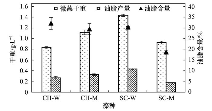 綜合而言, SC-W與CH-M藻種在城市污水中具有較好的生長與產(chǎn)脂性能, 同時對污水有較好的凈化效果, 為適宜于城市污水培養(yǎng)的高效藻種.