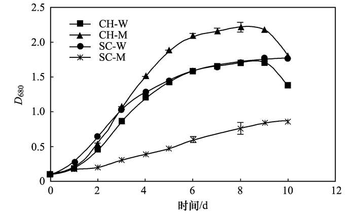 將4種微藻CH-W、CH-M、SC-W、SC-M按照初始濃度D680=0.1分別接種到城市污水原污水中.每天測一次D680值監(jiān)測其生長情況(圖 1).由圖 1可知, CH-M、CH-W、SC-W藻種在污水中生長情況良好, 具有較強耐污性能, D680最高可達1.5以上, 其中CH-M藻種D680最高.而SC-M藻種雖能保持持續(xù)生長, 但生長速率較低.后期的觀察發(fā)現(xiàn), CH-W與CH-M分別于第9d進入快速衰亡期, 而SC-W、SC-M均可以長時間保持在生長穩(wěn)定期.從穩(wěn)定性培養(yǎng)的角度看SC-W、SC-M更具有優(yōu)勢.