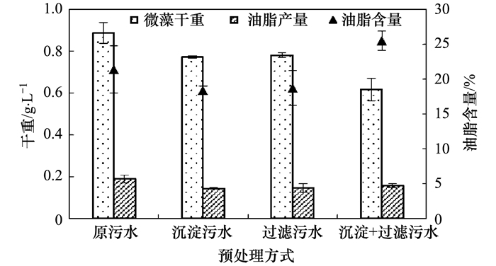 由圖 3、圖 4可知, 不同的微藻具有不同的耐污性能, 對污水預(yù)處理程度的要求也不同. SC-W在原污水中生物質(zhì)產(chǎn)量最高, 當使用沉淀、過濾單種預(yù)處理方式處理污水后, 會造成微藻干重的降低, 當使用沉淀與過濾聯(lián)合預(yù)處理方式處理污水后, 會造成微藻干重的進一步降低.由此可以看出斜生柵藻具有較強的耐污性能, 當污水中營養(yǎng)物質(zhì)越豐富時, 生長越好.微藻油脂產(chǎn)量由微藻生物質(zhì)產(chǎn)量和微藻油脂含量共同決定, 四種預(yù)處理方式中, 原污水預(yù)處理方式微藻生物質(zhì)產(chǎn)量最高, 微藻油脂含量較高, 所以總的微藻油脂產(chǎn)量最高, 為0.19 g·L-1.因此, 城市污水可不經(jīng)沉淀、過濾處理, 直接除去粗大懸浮物后作為培養(yǎng)基用于SC-W的培養(yǎng).而CH-M在原污水中的干重最低, 當經(jīng)沉淀、過濾單種預(yù)處理方式處理污水后, 干重有所提高, 當使用沉淀與過濾聯(lián)合預(yù)處理方式處理污水后干重最高. 4種預(yù)處理方式中, 沉淀與過濾聯(lián)合處理方式, CH-M油脂產(chǎn)量顯著高于其它3組(P < 0.05), 為0.16 g·L-1.由此可以看出, 小球藻比較喜歡相對潔凈的環(huán)境, 當污水中濁度越低時, 生長越好.試驗中發(fā)現(xiàn)污水濁度較高試驗組, CH-M更易于沉淀, 因此不利于其與營養(yǎng)物充分接觸, 會對其生長產(chǎn)生影響.因此, 城市污水經(jīng)沉淀+過濾預(yù)處理后更適合作為培養(yǎng)基用于CH-M的培養(yǎng).