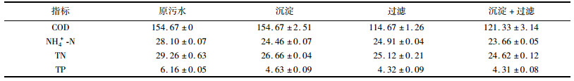 由表 4可知, 城市污水中COD含量經(jīng)沉淀處理后變化不大, 經(jīng)過濾、沉淀與過濾聯(lián)合處理后降低.城市污水中NH4+-N、TN、TP含量經(jīng)沉淀、過濾處理后有所降低, 經(jīng)沉淀與過濾聯(lián)合處理后進一步降低.總體而言, 原污水中氮、磷等營養(yǎng)物質(zhì)較為豐富, 但懸浮物也較多, 隨著處理程度的加深, 懸浮物減少, 但污水中的營養(yǎng)物質(zhì)損耗也會相應(yīng)增加.