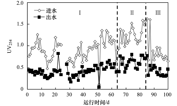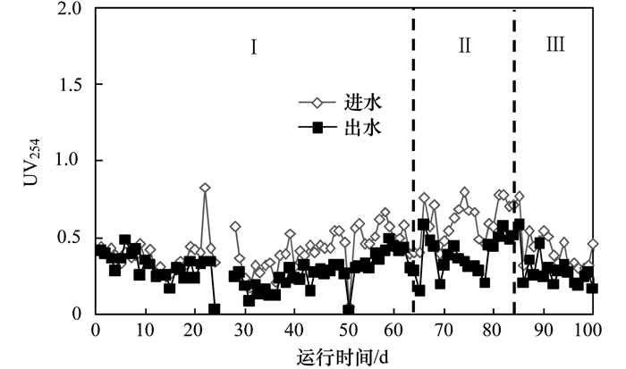 生化處理過程中, BR進出水UV254值如圖 10所示.從中可見, 經過生化處理后, BR出水UV254值進一步降低.第Ⅰ階段進出水平均UV254值分別為0.41和0.28;第Ⅱ階段進出水平均UV254值分別為0.63和0.40;第Ⅲ階段進出水平均UV254值分別為0.41和0.30.可見, 生化處理能夠進一步去除微氣泡臭氧催化氧化處理后剩余復雜結構有機物, 但去除效率相對較低.