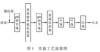 該處理系統(tǒng)是由均相催化臭氧紫外氧化+ 混凝沉淀預(yù)處理,再由厭氧和好氧后續(xù)處理3 部分組成,廢水經(jīng)臭氧預(yù)處理之前先加入催化劑。實驗裝置見圖1。