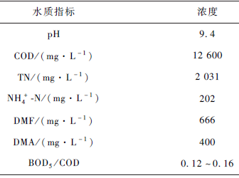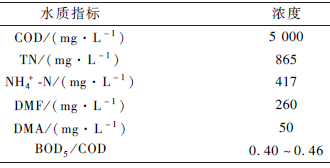 實驗中COD、NH4+ -N 和TN 按第4 版《水和廢水監(jiān)測分析方法》測定 。COD 采用重鉻酸鉀法測定;TN 采用堿性過硫酸鉀消解紫外分光光度法;NH4+ -N 用納氏試劑比色法;DMF 采用分光光度法;DMA 采用HCl 滴定法。各監(jiān)測指標均重復(fù)測3 次,取平均值作為最終的測定結(jié)果。