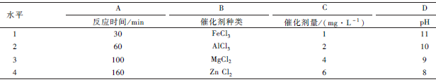 對該實驗進行極差分析,得到各個因素對臭氧氧化處理的效果的影響順序為:B > C > A > D,得出最佳參數(shù)條件為A2 B2 C3 D4 ,即當(dāng)反應(yīng)時間為60 min,選擇AlCl3 做催化劑,催化劑的投加量為4 g·L - 1 ,反應(yīng)pH 為8 時,DMF 的去除率最高達到60. 9% ,出水DMF 含量在260 mg·L - 1 左右。