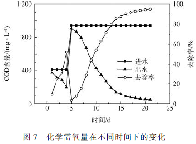 取活性污泥300 mL、厭氧處理廢水500 mL 加入到1 000 mL 錐形瓶,補充自來水至1 000 mL,置于32 ℃ 恒溫反應(yīng)器中進行好氧處理,好養(yǎng)反應(yīng)器采用微孔曝氣,當(dāng)COD 含量出現(xiàn)穩(wěn)定降低時換水進行全負荷運行。每天11:00—12:00 取樣測定廢水中COD。測得結(jié)果見圖7。