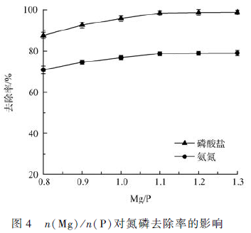 調(diào)節(jié)廢水pH 至9. 5,加入不同量的MgCl2 溶液,控制n(Mg) ∶ n(P)分別為0. 8 ∶ 1、0. 9 ∶ 1、1 ∶ 1、1. 1 ∶ 1、1. 2 ∶ 1 及1. 3 ∶ 1,反應(yīng)20 min 后取上清液分別測定水中的PO4^3- 和NH4+ -N,得出結(jié)果如圖4 所示。