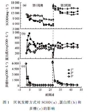 化學(xué)需氧量(COD)、懸浮污泥濃度(MLSS)及可揮發(fā)性污泥濃度(MLVSS)、NH4+ -N、PO4^3- -P 等根據(jù)標(biāo)準(zhǔn)方法測定。可揮發(fā)性脂肪酸(SCFAs)采用Agilent 6890 氣相色譜儀測定,色譜柱為DB-MAXETR(30 m × 530 μm × 1 μm),氮?dú)庾鲚d氣(N2 ),流速為25 mL·min - 1 ;檢測器為氫火焰離子檢測器(FID);進(jìn)樣口溫度為220 ℃ ;檢測器溫度控制在250 ℃ 。采用程序升溫,起始爐溫80 ℃ 運(yùn)行1 min,然后以20 ℃ ·min - 1 的速度升溫到160 ℃ ,運(yùn)行1 min,最后以5 ℃ ·min - 1 的速度升溫到180 ℃ ,運(yùn)行2 min,一個(gè)樣品的整個(gè)運(yùn)行時(shí)間為20 min。進(jìn)樣量為2. 0 μL,每個(gè)樣品測定3 次,取平均值進(jìn)行分析。分析各種酸成分并換算成COD,乙酸(∗1. 07)、丙酸(∗1. 51)、異丁酸(∗1. 82)、正丁酸(∗1. 82)、異戊酸(∗2. 04)及正戊酸(∗2. 04)。多糖采用硫酸-蒽酮分光光光度法測定,蛋白質(zhì)采用Lowry-folin 試劑分光光度法測定 。蛋白酶采用偶氮酪蛋白分光光度計(jì)方法測定。α-葡萄糖苷酶采用對硝基-a-d-吡喃葡萄糖苷分光光度計(jì)法測定 。輔酶420 采用異丙醇提取法測定。pH 采用oxi/340i WTW 測定。