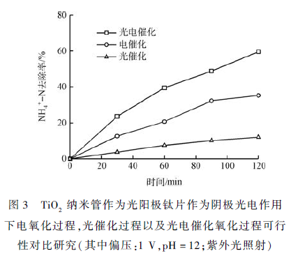 在提高含氮有機污染物降解率的研究中,將電化學和光化學氧化法相結(jié)合(光電協(xié)同) 的技術(shù),即光電催化技術(shù)已成為目前研究的熱點之一 。將電化學法與光催化法聯(lián)合,簡稱“光電法 ”,是一種新型的高效的除氨氮的方法 。這種方法雖然單位時間的能耗較電化學法和光催化法略有增加,但氨氮去除率得到提高,從而使得能量利用率得到提升。本研究針對水體中廣泛存在的檸檬酸銨中氨氮難去除的現(xiàn)象,采用陽極氧化方法制備了二氧化鈦納米管電極,進行光電催化降解氨氮研究,結(jié)果表明2 h 能降解60% 以上,且產(chǎn)物80% 以上轉(zhuǎn)換為氮氣。