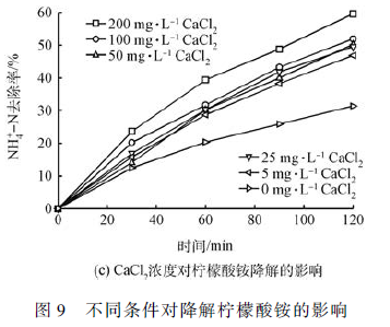 圖6 分別對比了在其他條件相同情況下改變投加量的初始檸檬酸銨的大小對氨氮去除的影響?梢钥闯,投加檸檬酸銨量越多去除效果越好。在初始濃度25 和50 mg·L - 1 時2 h 去除效果高達60% 左右。初始濃度5、10 和15 mg·L - 1 以N 計的檸檬酸銨時,2 h 去除效果分別為51. 7% 、45. 7% 和47. 2% 。原因在于加入的CaCl2 的量一定,檸檬酸銨的濃度越大,生成的檸檬酸鈣越多,反應(yīng)越容易進行,從而去除效果越好?偟膩碚f,檸檬酸銨初始濃度不同對去除效果影響不大,沒有明顯的變化趨勢。