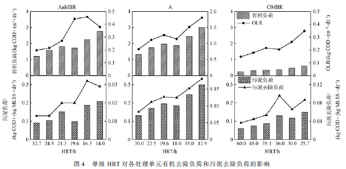 HRT 是廢水處理系統(tǒng)最重要的設(shè)計和運行參數(shù),直接影響污泥微生物降解污染物的效果,一定程度上延長HRT 可以提高污染物的降解率。但適當(dāng)縮短HRT 能夠充分利用污泥的微生物生物活性,提高其有機(jī)負(fù)荷和污泥去除負(fù)荷。在保證系統(tǒng)處理效率的前提下,綜合考慮有機(jī)污染物的去除效果,同時使An-MBR 單級去除負(fù)荷達(dá)到最大,確定處理系統(tǒng)總HRT 為61. 3 h,AnMBR、A、OMBR 各處理單元的單級HRT分別為16. 3、15 和30 h。