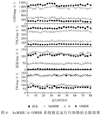 保持AnMBR/ A/ OMBR 系統(tǒng)在上述最優(yōu)運行參數(shù)下穩(wěn)定運行80 d,考察系統(tǒng)連續(xù)運行階段各反應(yīng)器出水COD、TOC、NH3 -N 和TN 的濃度變化如圖6所示。