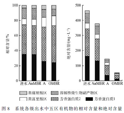 通過積分各區(qū)的熒光強(qiáng)度,計算得到各樣品五區(qū)有機(jī)物的相對含量,乘以各樣品TOC 濃度得到其絕對含量,如圖8 所示。結(jié)果表明,進(jìn)水中Ⅰ、Ⅱ區(qū)的芳香族蛋白質(zhì)類似物和Ⅳ區(qū)溶解性微生物副產(chǎn)物的總和所占比例達(dá)88. 5% ,系統(tǒng)處理出水中Ⅱ區(qū)芳香族蛋白質(zhì)類似物占40% ,表明Ⅱ區(qū)芳香族蛋白質(zhì)類似物較難降解,與相關(guān)研究報道相符。具體參見污水寶商城資料或http://wlmqsb.com更多相關(guān)技術(shù)文檔。