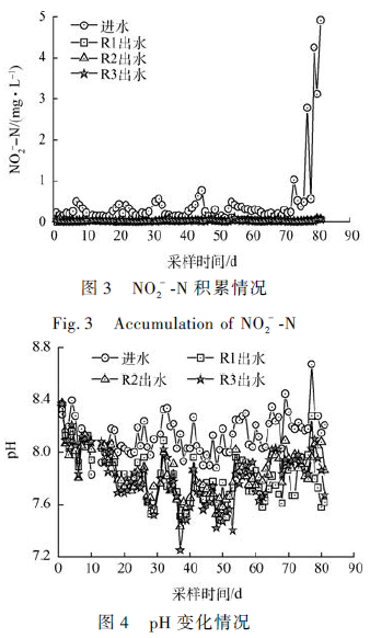 圖3 為反應(yīng)器NO2- -N 的積累情況。運(yùn)行初期反應(yīng)器進(jìn)水NO2- -N 濃度較低,出水NO2- -N 濃度均小于0. 1 mg·L - 1 ,無NO2- -N 積累。然而從第73 天開始,由于夏季氣溫異常升高(好氧池水溫達(dá)到40℃ ),污水處理廠生化系統(tǒng)硝化效果變差,導(dǎo)致反應(yīng)器進(jìn)水中NO2- -N 大量積累。但3 套反應(yīng)器出水中NO2- -N 濃度仍維持在較低的水平,表明反應(yīng)器對(duì)NO2- -N 的去除效果較好。