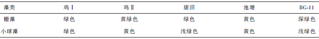 小球藻和柵藻在不同培養(yǎng)基中培養(yǎng)23 d 后,收獲的藻液顏色情況如表2 所示。