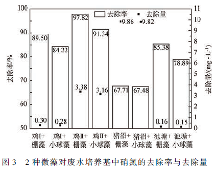 由表1 可見,雞Ⅱ和豬沼培養(yǎng)液中硝氮的濃度大于氨氮濃度,氨氮的抑制作用較弱,2 種微藻對硝氮的吸收利用較多。尤其在豬沼中,雖然2 種微藻的去除率都不高,但是去除的絕對量最多(柵藻9. 86mg·L - 1 ,小球藻9. 82 mg·L - 1 )。對于雞Ⅰ和池塘培養(yǎng)液,雖然氨氮濃度大于硝氮,抑制作用強(qiáng),但因其初始值很低,故而雖實(shí)際的去除量并不大但去除效率高。有研究結(jié)果顯示,硝氮較適合普通小球藻的生長。因此,在硝氮含量最高的豬沼培養(yǎng)液中收獲的小球藻藻粉質(zhì)量也最多。對比2 種微藻對硝氮的去除率發(fā)現(xiàn),柵藻對硝氮的吸收同化效果稍好于小球藻。