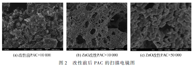 圖2 分別是改性前,及不同ZnO 改性濃度下的場(chǎng)發(fā)射掃描電鏡圖。由圖2(b)可以看出,ZnO 改性后的PAC 孔徑變大并仍然具有穩(wěn)定的球狀結(jié)構(gòu),這是由于在改性過程中,聚丙烯腈纖維轉(zhuǎn)化成一種梯形鏈狀結(jié)構(gòu),該結(jié)構(gòu)能夠抵抗高溫,最終得到穩(wěn)定的多孔PAC 材料。由圖2(c)可以看出,有球狀的ZnO負(fù)載于PAC 的表面,該結(jié)果與紅外譜圖相一致,在制備過程中,Zn 取代H 負(fù)載于PAC,提高PAC 的吸附性能。