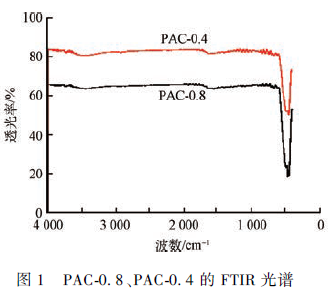 圖1 為頻率范圍(4 000 ~ 0 cm - 1 )的PAC-0. 8 和PAC-0. 4 紅外光譜。從已知的活性炭紅外光譜圖可知,PAC-0 在3 440 /1 595、1 451、1 219 和1 043 cm - 1處分別存在O—H 伸縮鍵,aromatic C—C 伸縮鍵,C—O 伸縮鍵,CH2 —O—CH2 的C—O 伸縮鍵。從圖1 中可以發(fā)現(xiàn),ZnO 修飾過的活性炭在453 cm - 1 處存在一個(gè)加載的PAC 鋅的吸收帶。這些吸收帶的位置和數(shù)量不僅取決于晶體結(jié)構(gòu)而且也取決于顆粒形貌和化學(xué)成分。已知ZnO 吸收帶的參考光譜在406 ~ 512 cm - 1。由此可知,圖中的吸收帶應(yīng)該是ZnO 修飾造成的。