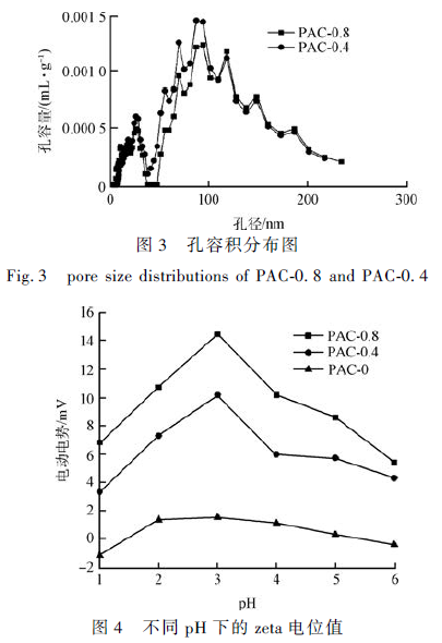 改性前后材料其Zeta 電位如圖4 所示。從圖4可知, 溶液pH 在1 ~ 3 時(shí), PAC-0. 8、PAC-0. 4 和PAC-0. 0 吸附劑zeta 電位為正值,且逐漸升高。溶液pH 在3 ~ 6 時(shí),PAC-0. 8、PAC-0. 4 和PAC 吸附劑zeta電位仍為正值,但逐漸降低。PAC-0. 8 始終高于PAC-0. 4;而且PAC-0. 8 和PAC-0. 4 zeta 電位的值也是始終高于PAC-0. 0。這種現(xiàn)象表明鋅的濃度直接影響吸附材料中帶正電荷離子數(shù)量。